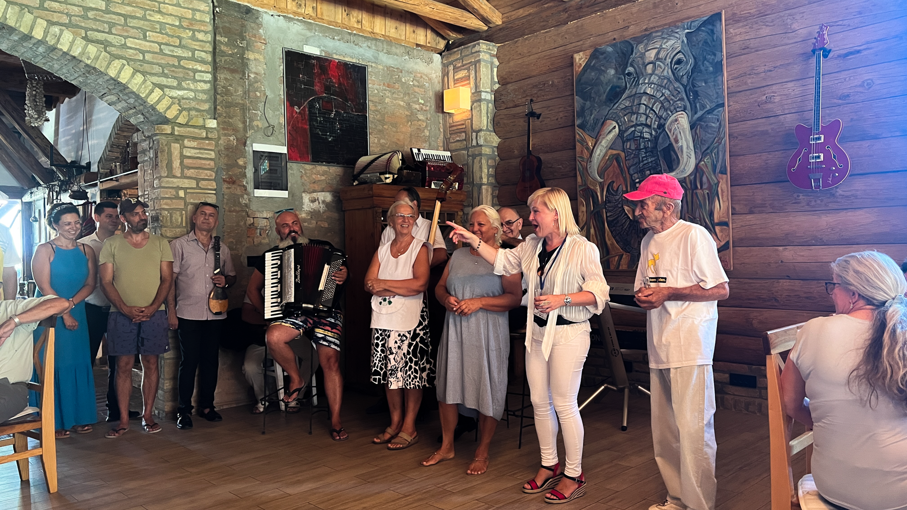 Mens vi spiser er der 4 musikere som spiller serbisk musik og kombinationen af det serbiske indrettede hus, musikken, den fantastiske mad og den unikke karakter som Theodor er i sandhed et unikt højdepunkt på Donau turen.