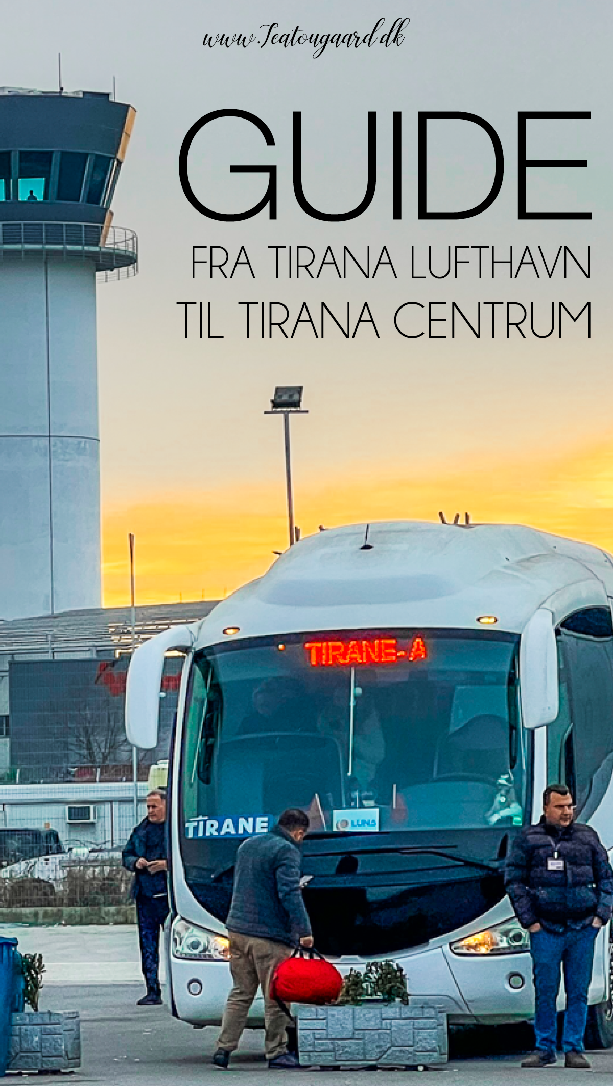 På bussen er der rød skrift, hvor der stod “Airport Tirana”. Det er selskabet Luna travel der her bussen og de hjælper dig med at lægger din kuffert ind i bussen.