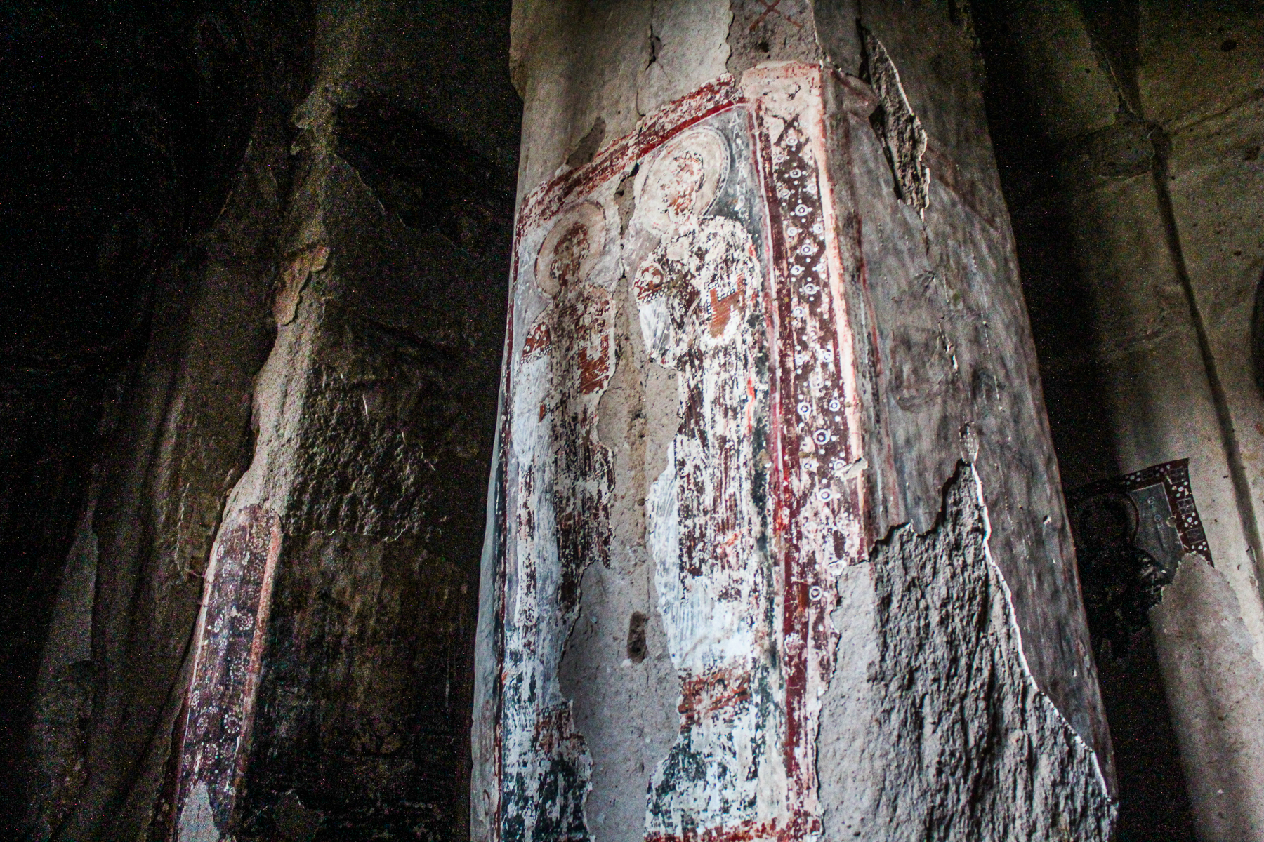 De smalle korsarme i nord syd og øst omgiver det centrale område som er dekoreret med et korsrelief. Den østlige apsis er afgrænset af enkle parapeter og indeholder et alter. Freskoerne dateres til perioden mellem det 9. århundrede og første halvdel af det 11. og det 12. århundrede.