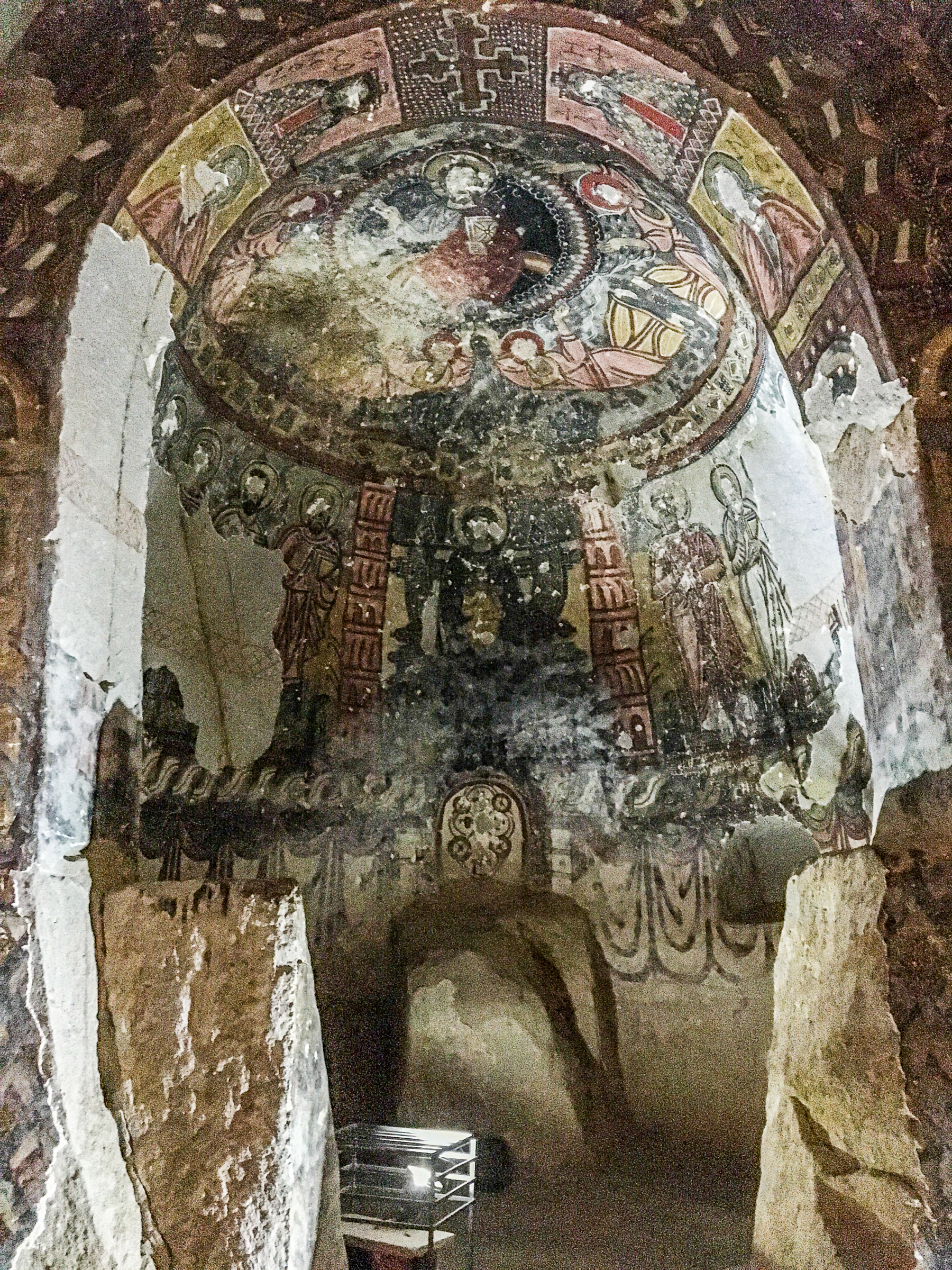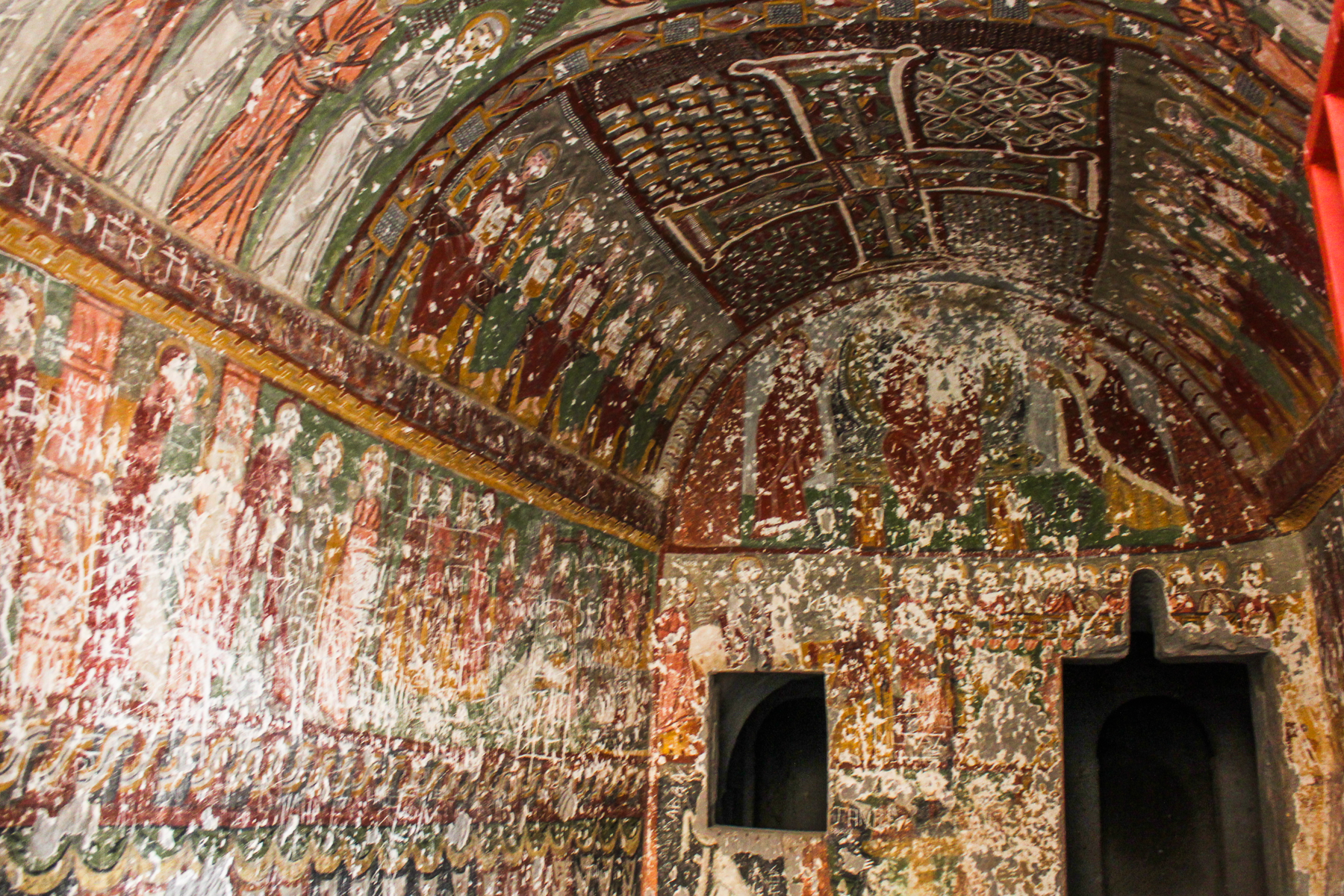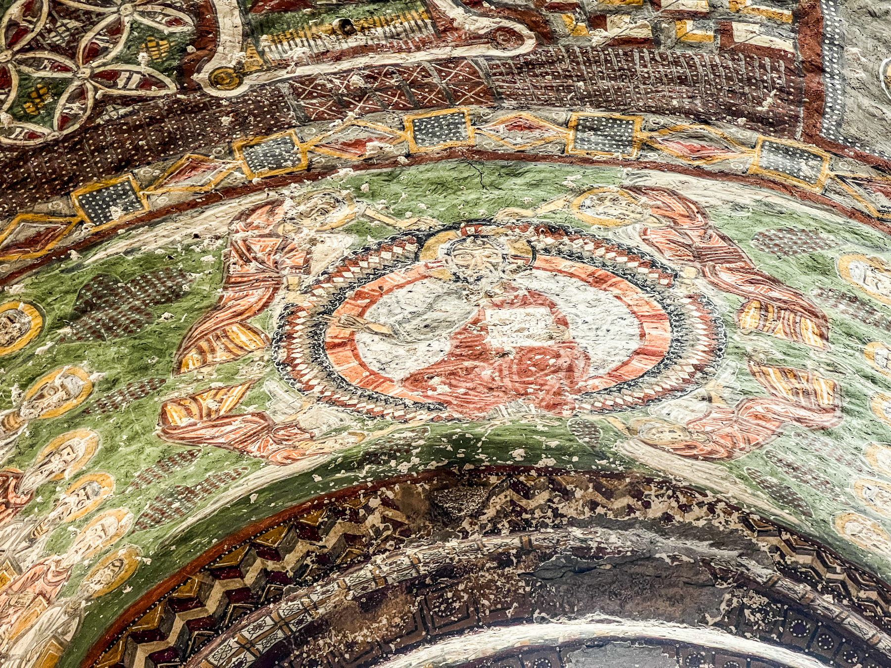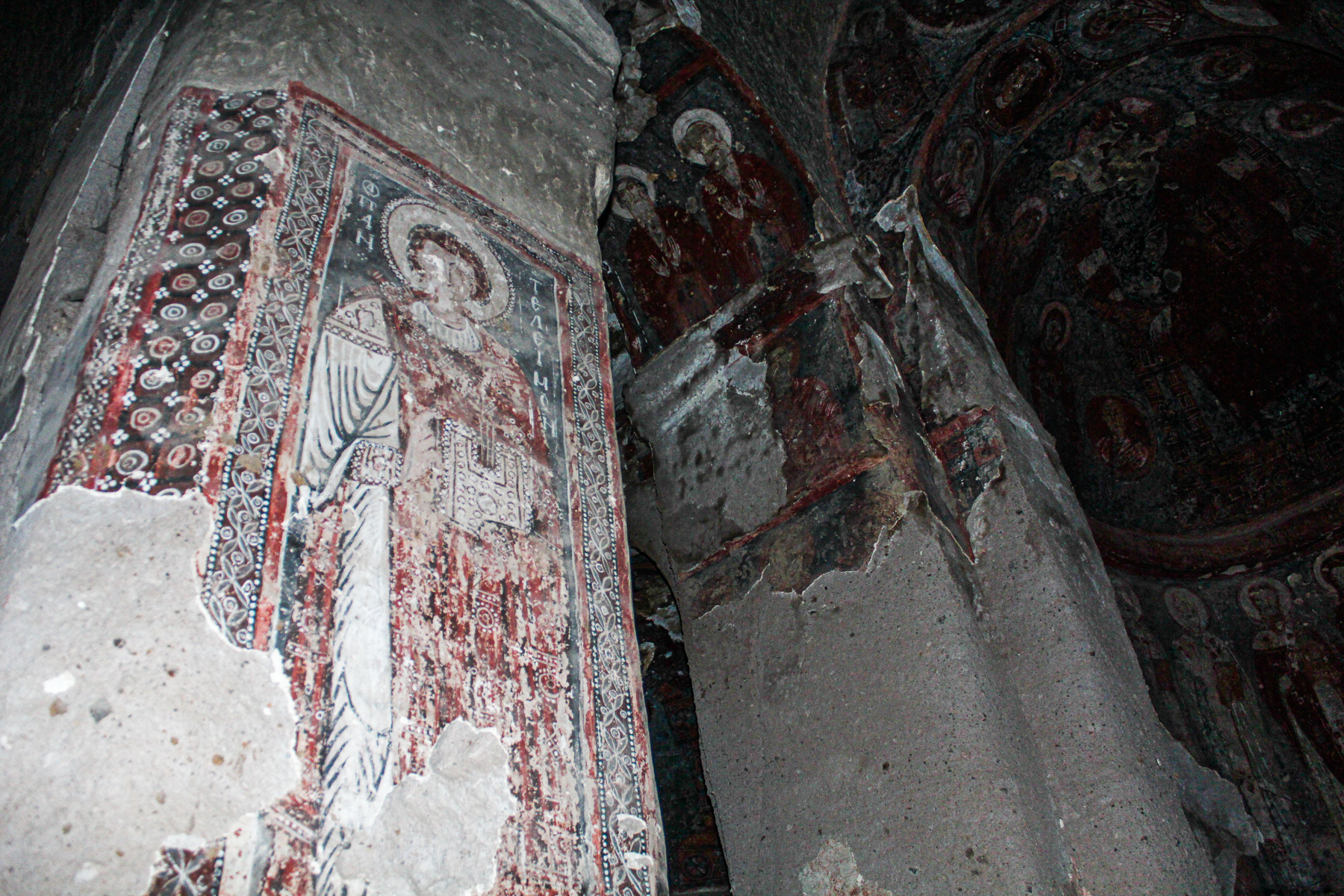 Apsisens halvkuppe (venstre side ødelagt): Deesis-scenen, Biskop Athenogenes, Blasios, Nikolaos og Diakon Stephanos (nederste bånd) og Kosmas, Damianos, Thalelaios og Rafael (på sejrsbuen)