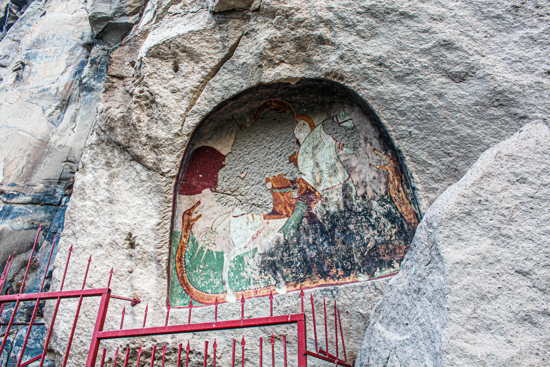 På inskription står der: “Dette tempel, bygget til ære for den herlige og store martyr Sankt Georgios, blev storslået dekoreret trods vanskelighederne, med stor hjælp og ønske fra hustruen til Amirarzes Basileios Giag (oupes) og Tamara, som er illustreret her.”