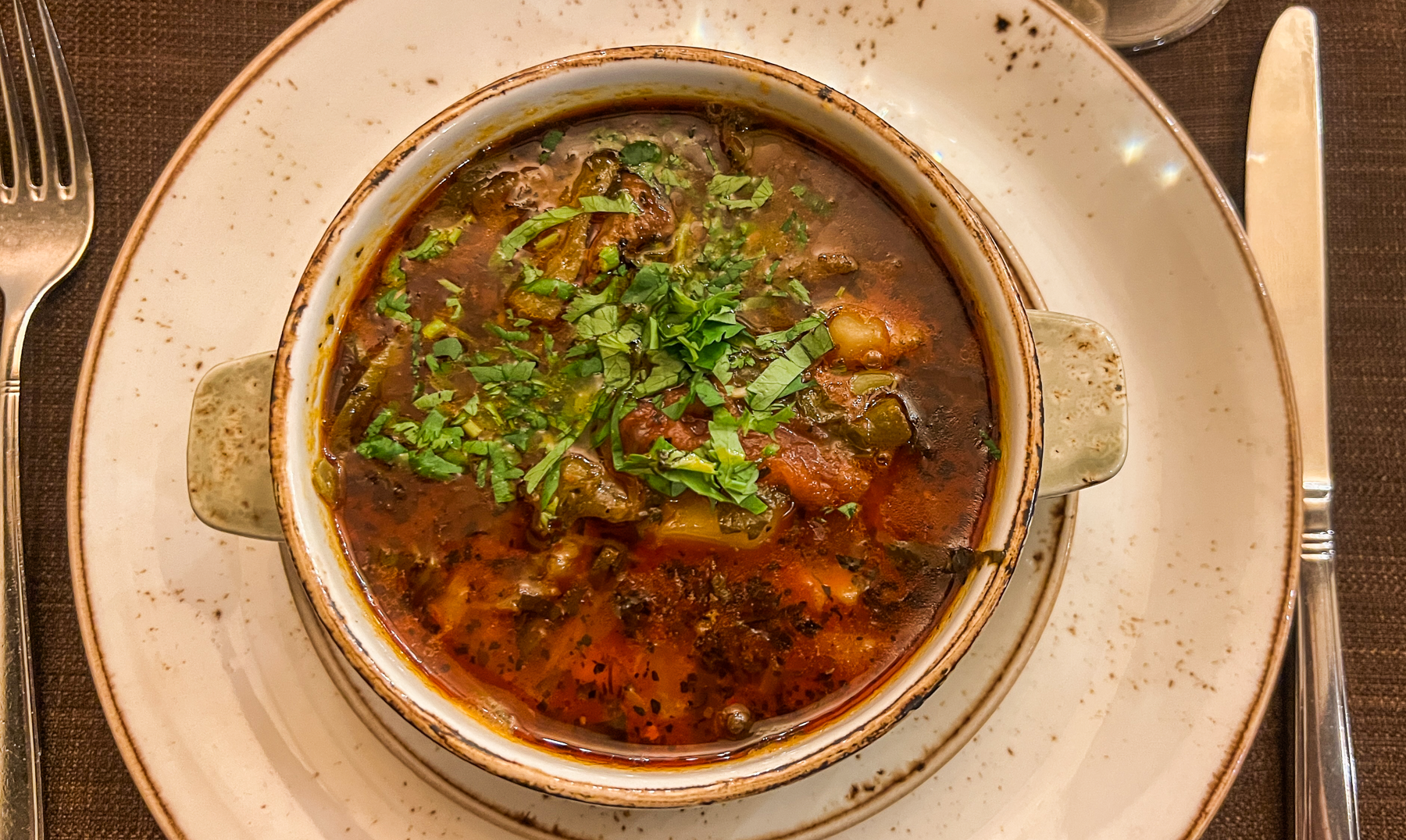Retten afsluttes med hvidløg, krydderier og urter og overhældes med en god, kraftig armensk vin. Det er en enkel, men virkelig velsmagende ret fra det armenske køkken.