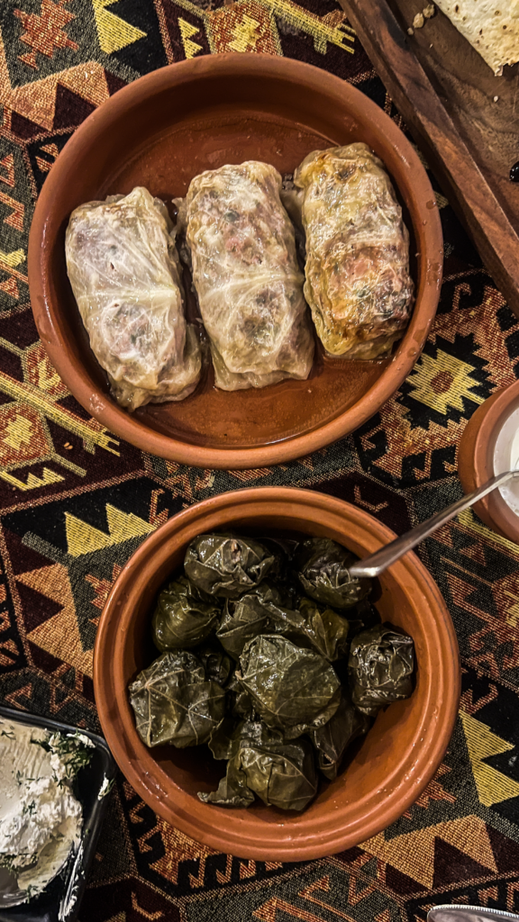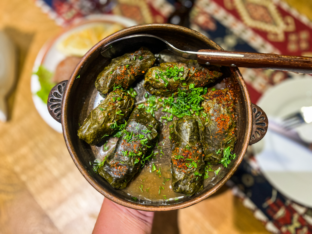 De lokale hævder, at Aserbajdsjan har verdens bedste dolma, og deres begrundelse er, at druevinene oprindeligt stammer fra landets bjergrige dale. Personligt er jeg helt enig, jeg synes også de aserbajdsjanske vindrueruller er bedre end de tyrkiske, og det er på trods af jeg bor i Tyrkiet, men det er fordi det kødfyld der er i dem er så utrolig lækkert.