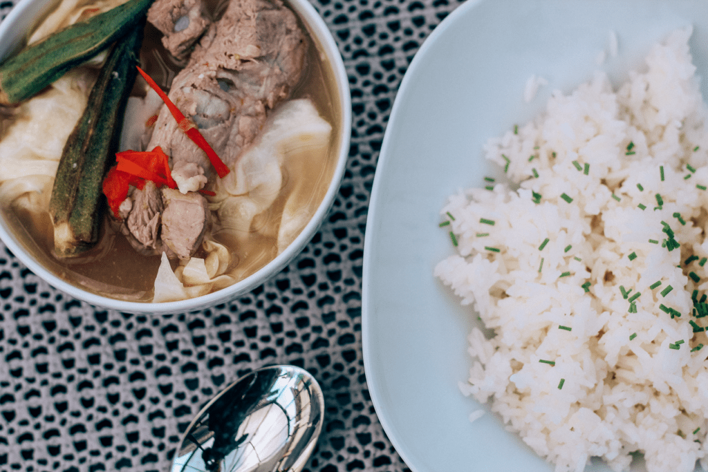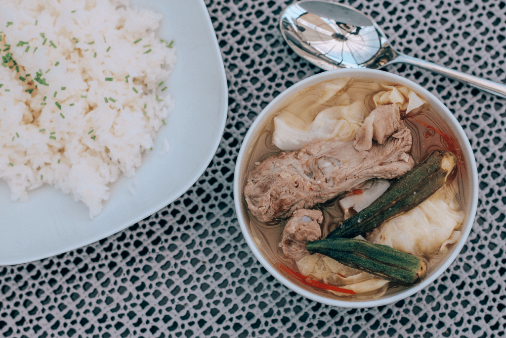 Den filipinnske sinigang suppe bliver ofte serveret alene eller sammen med dampet ris.
