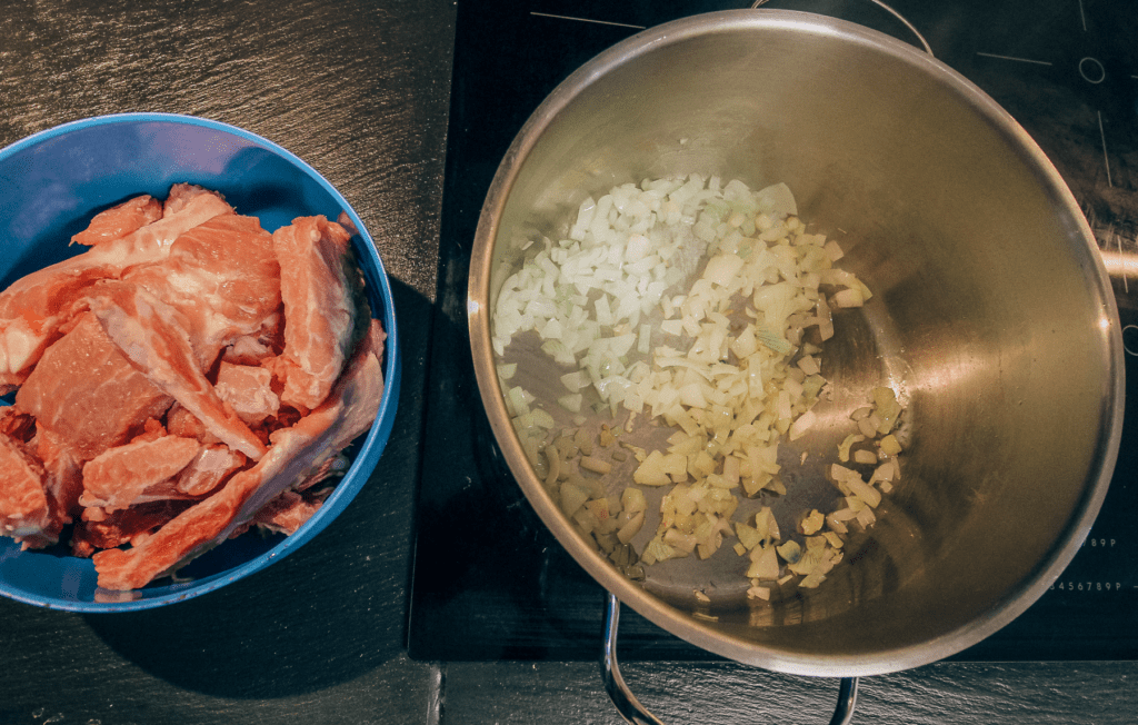 Hak løgene fint og sautere den i en stor gryde (husk der skal være plads til de øvrige ingredienser). Når løgnene er blanke tilsættes kødet. Rør rundt til det meste af kødet har skiftet farve.