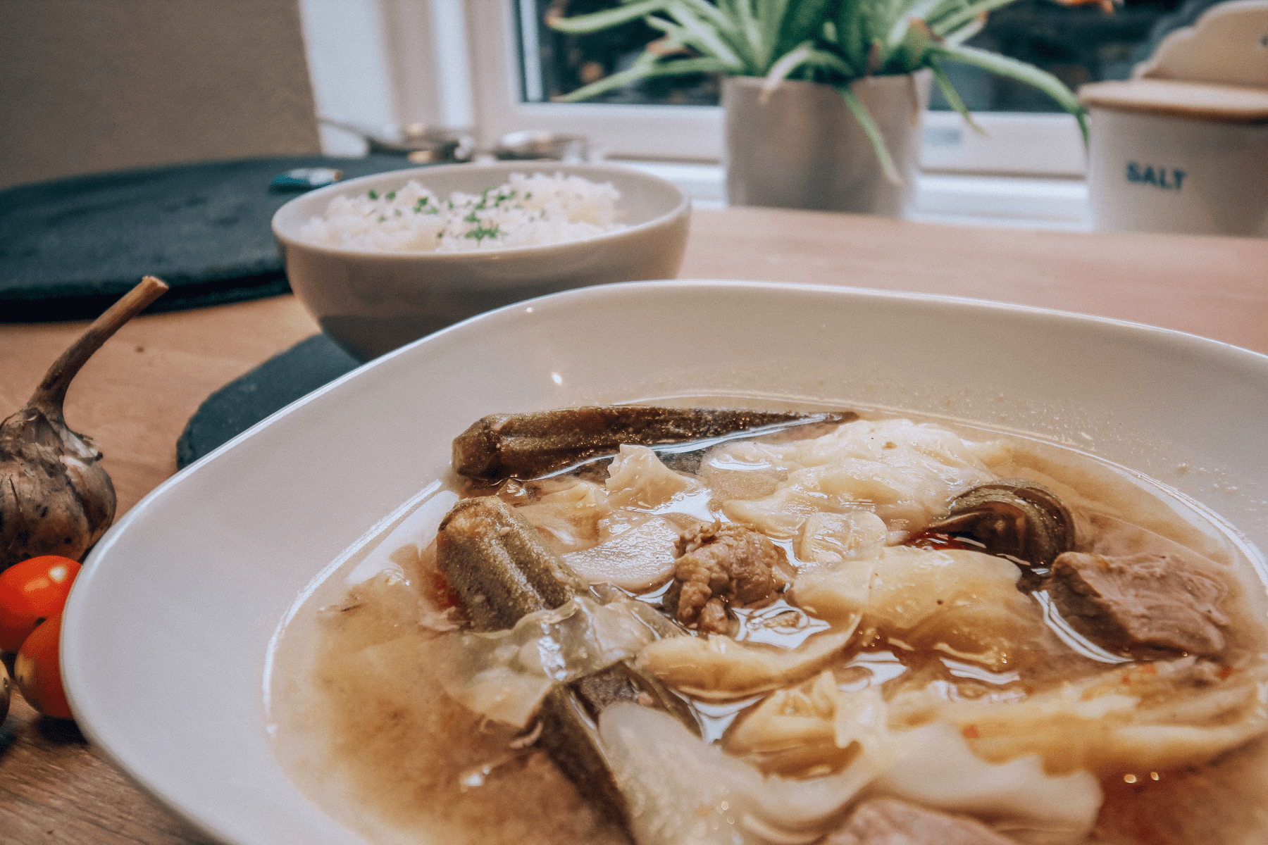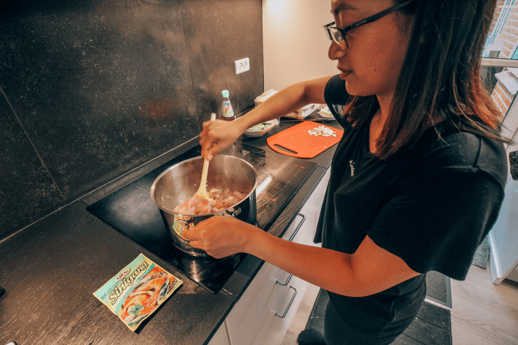 En af de retter vi har lavet sammen er Sinigang som er en filipinsk svinekødssuppe med okra og spidskål.