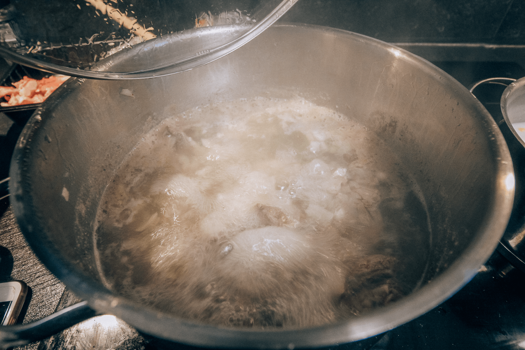 Dæk indholdet af gryden med en liter vand (eller til alt er dækket af vand). Kog op uden låg og lad urenhederne (skum) flyde til overfladen. Fjern skummet grundigt med en hulske eller spatel. Skummet er urenheder fra kødet, så det vil man gerne have væk.
