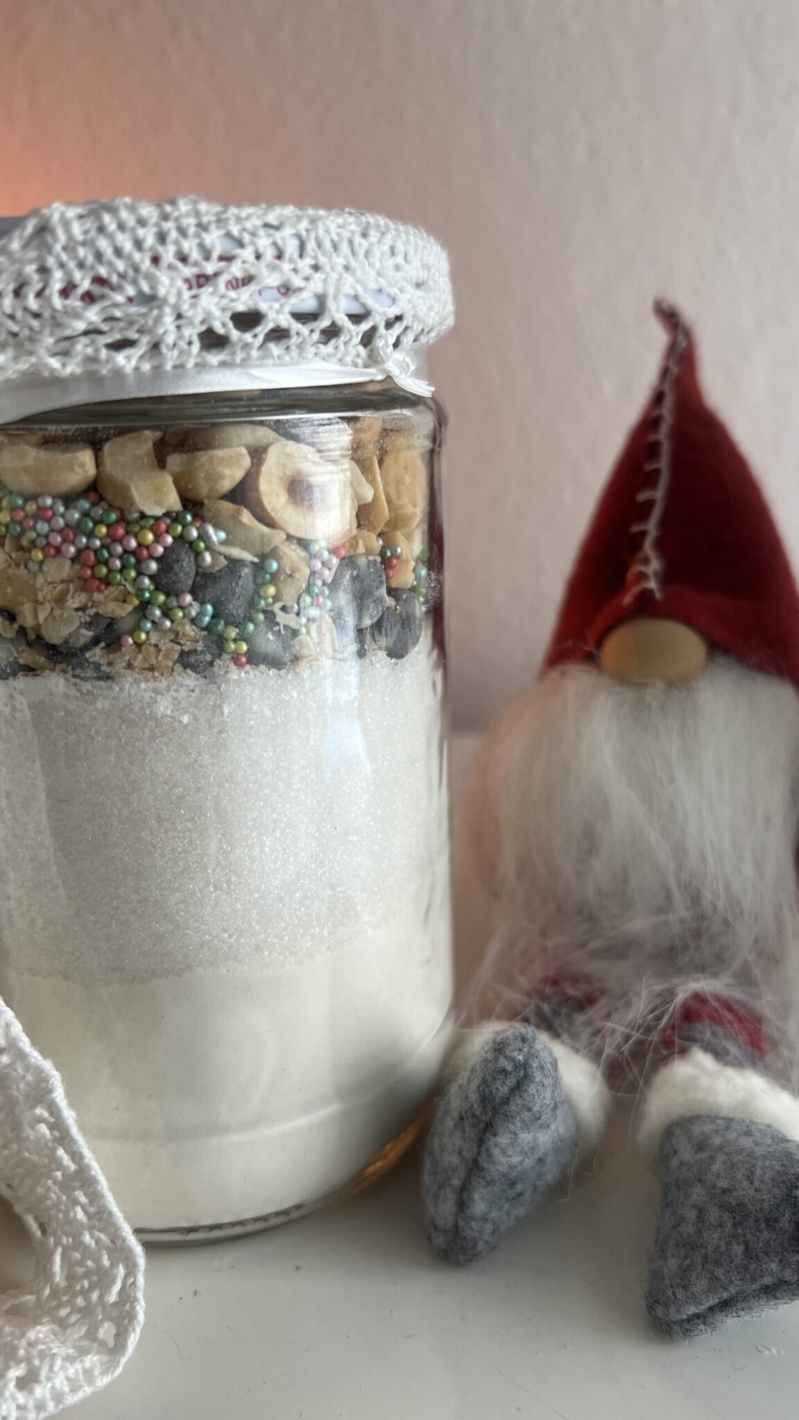 Jeg har selv konstrueret dagen i dette glas, som jeg lavede til min veninde Bilge til den adventskalender jeg lavede til hende. Opskriften kan naturligvis tilpasses, efter dine egne ønsker, f.eks med forskellige slags nødder eller en anden type krymmel.