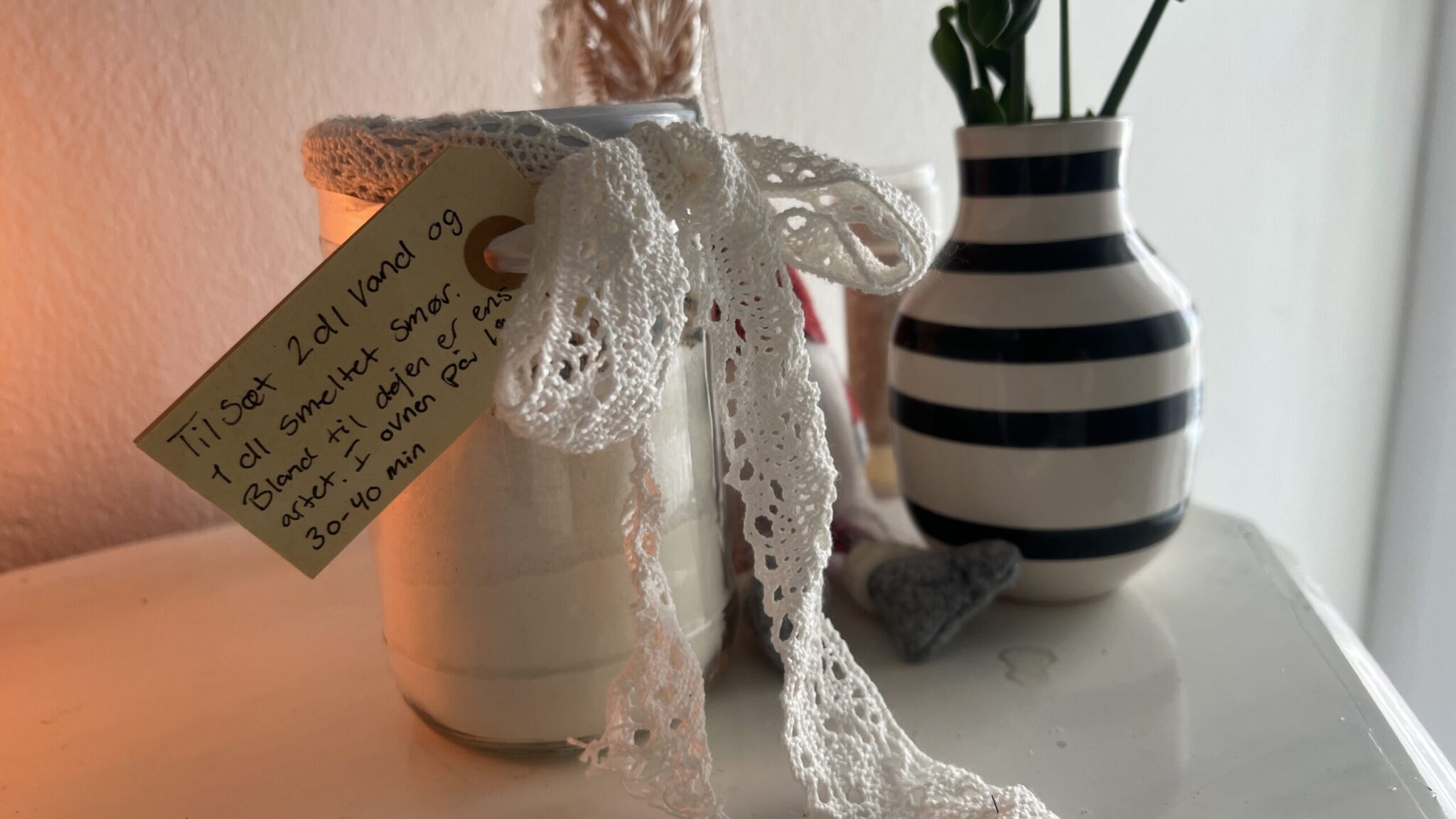Du kan enten brug et gammel syltetøjsglas eller et glas du køber. Strøelsen på glasset bør være omkring 500 ml. Jeg pyntede mit glas med et hvidt bånd og en note med hvordan kagen skulle laves. Hvordan du laver din note er ikke vigtigt, men det er naturligvis vigtig at gavemodtageren får en note om hvordan kagen skal tilberedes.