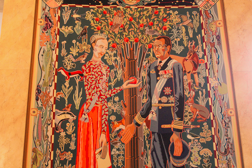 Gobelinerne var målet og de er i De kongelige Repræsentationslokaler. Disse lokaler danner rammen når dronningen modtager sine gæster og det er et spændende lokale. Gobelinerne er modsat alt andet royalt kunst, jeg har set. Det er farverigt, fantasifuld og næsten som et “tegneserie tæppe”. Historiske begivenheder og personligheder er en del af nogle af tæpperne mens andre fortæller kongefamilien historie. Gobelinerne omfavner 1100 års historie på de vævede kunstværker.