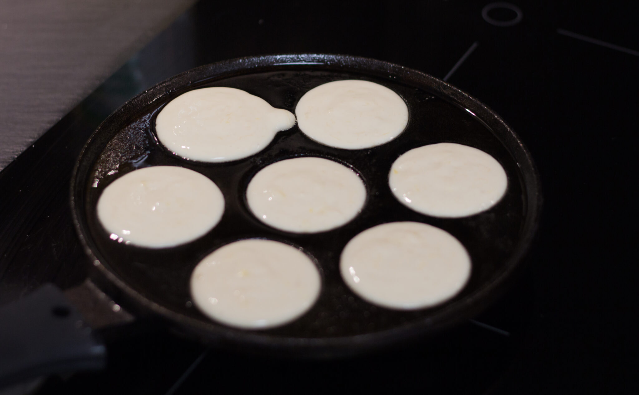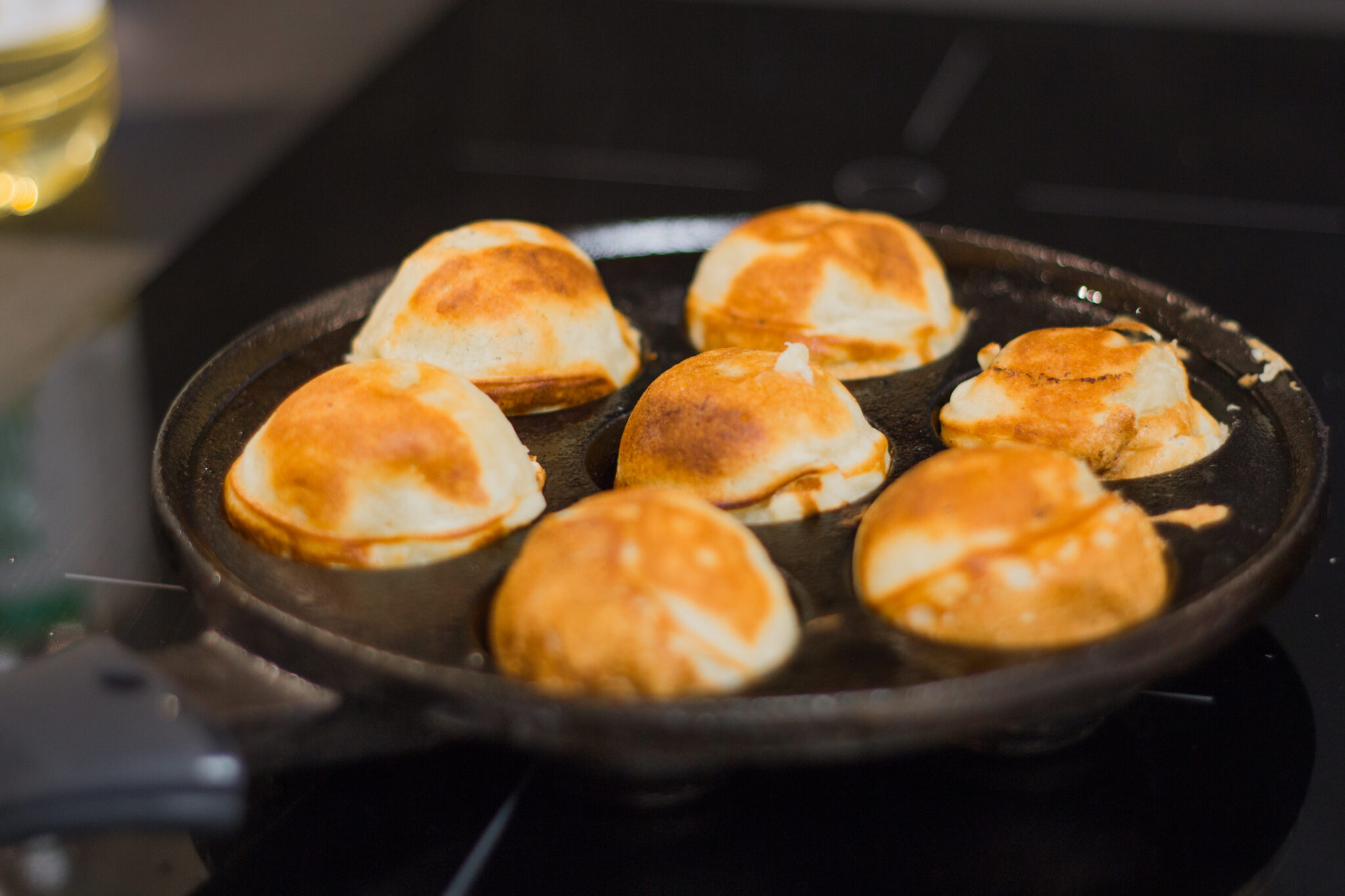Det kræver et æbleskivepande at lave veganske æbleskiver. Varm panden godt op og hæld en god slat rapsolie i hvert hul.